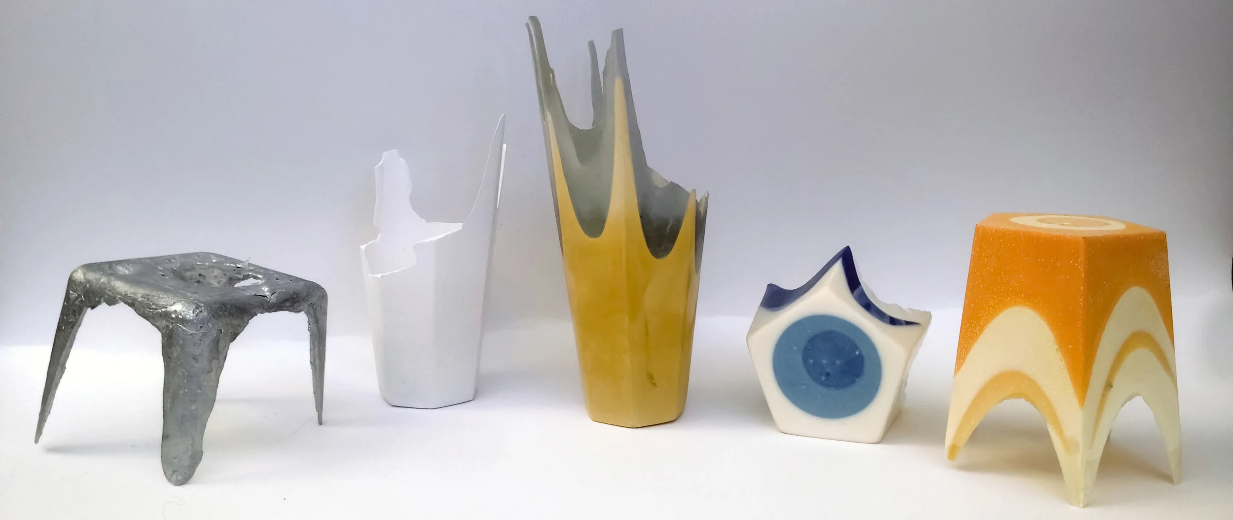 In the early years of the degree, I did multiple experiments in metal casting and working with ceramics, so I knew that my final, graduation project would explore this issue further. Although this final project began with metal casting with motion, as soon as I got my hands on polymer resins, the project saw a significant shift in the form of layers, colors, and combinations of different materials that were possible. The result was the "Matter of Motion" series of works that you now see.