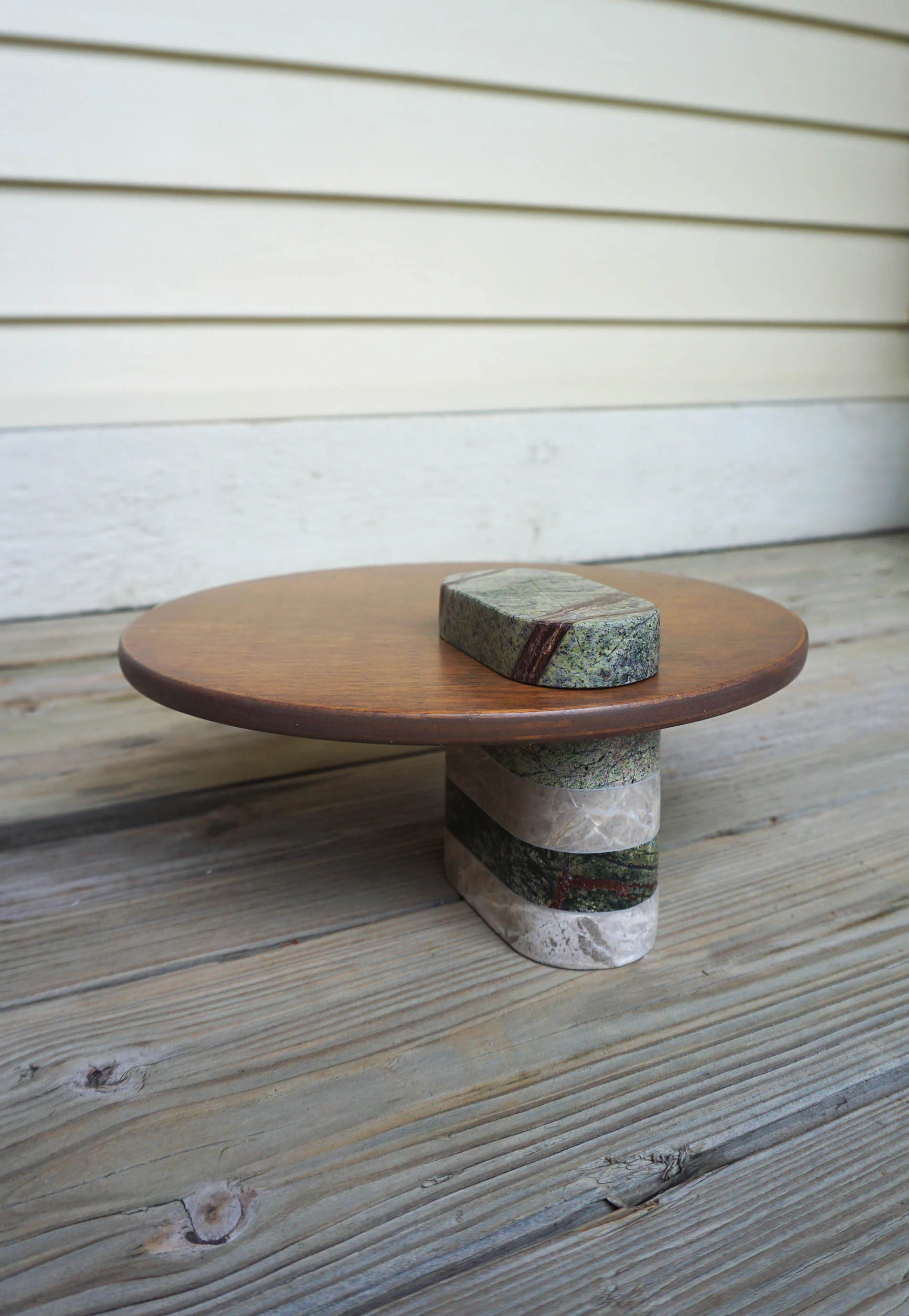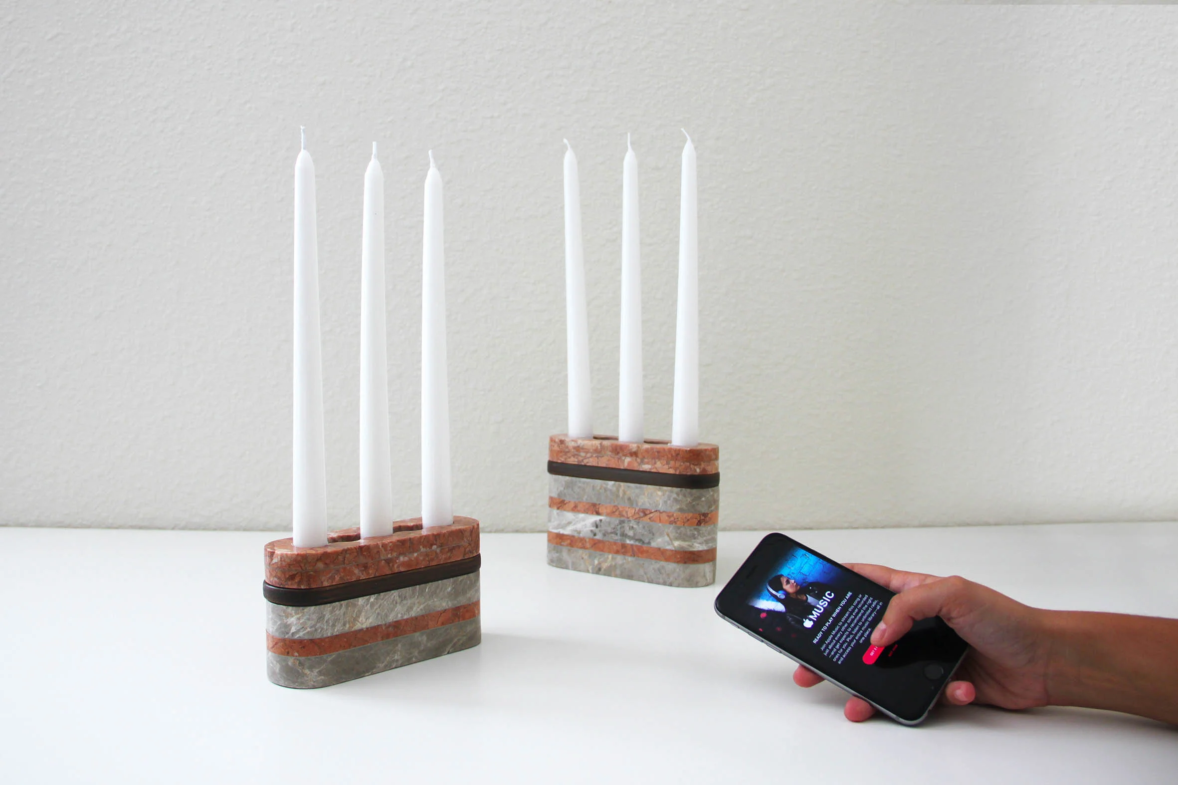 The Loud Objects collection consists of candle holders, serving plates and vases comprising a bold, graphic composition of marble blocks and wooden plates. In each piece, as the marble blocks touch the wooden plate on either side, it resonates and turns into a speaker.
