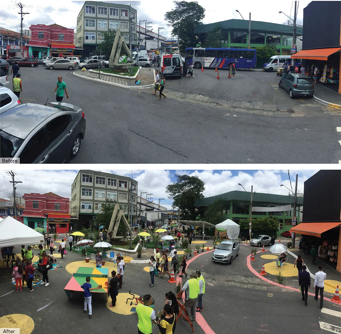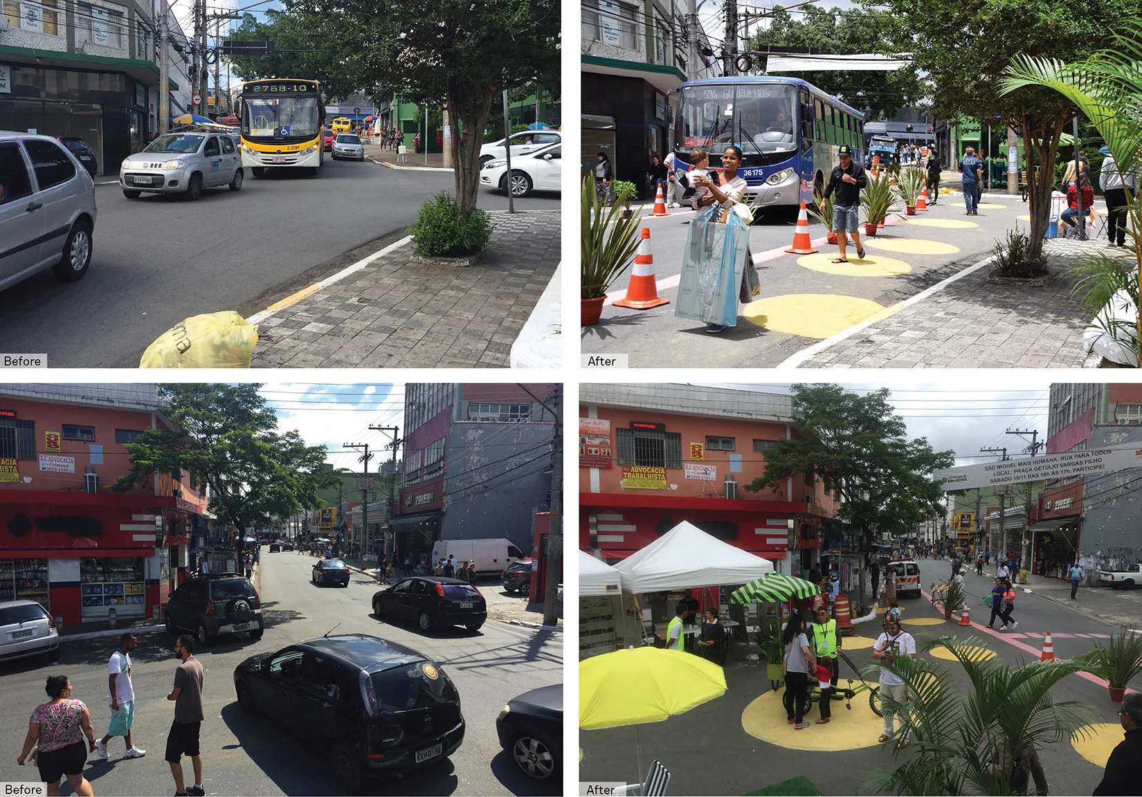 A vibrant and active pedestrian plaza, and multiple pedestrian crossings emerge during NACTO's one-day pop-up transformation event in Sao Miguel, São Paulo.
