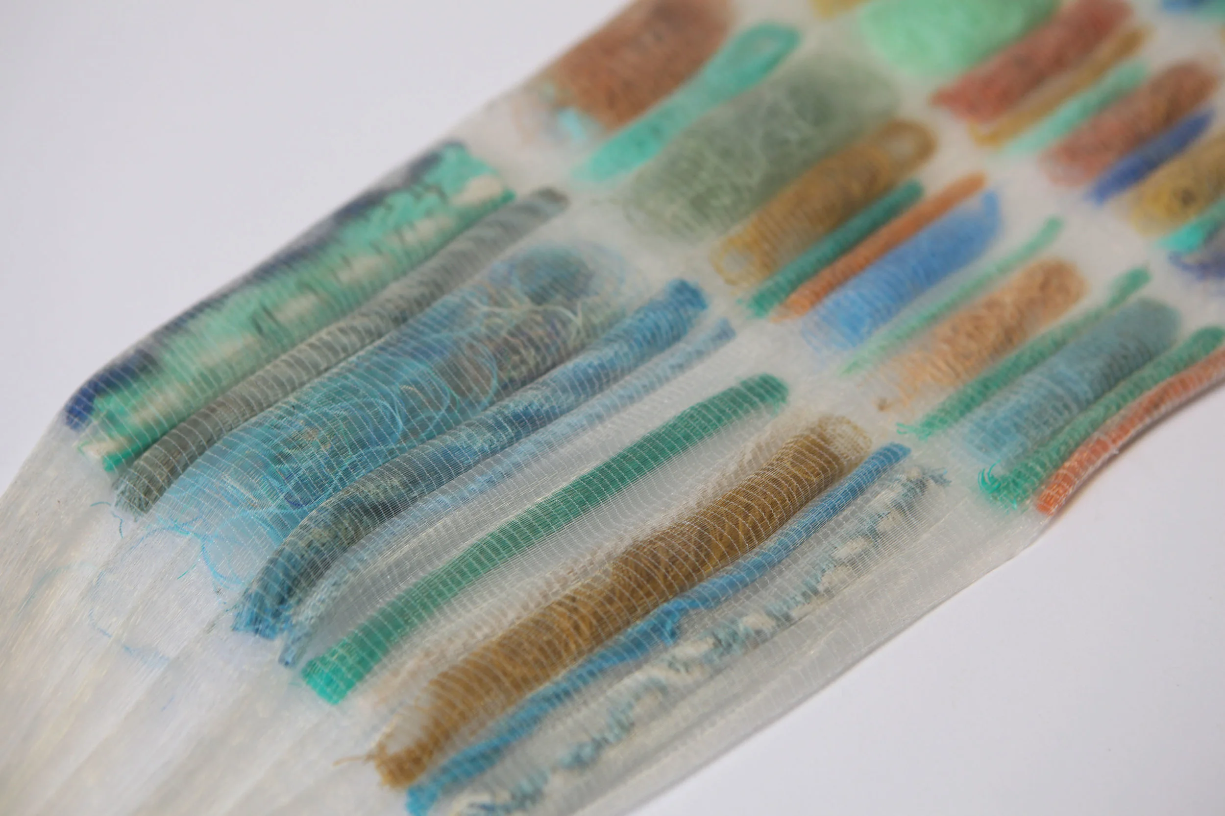 A gauzy, translucent material, with an array of colorful bits of string or rope, suspended in it–like colored gems almost, set in a diaphanous framework.